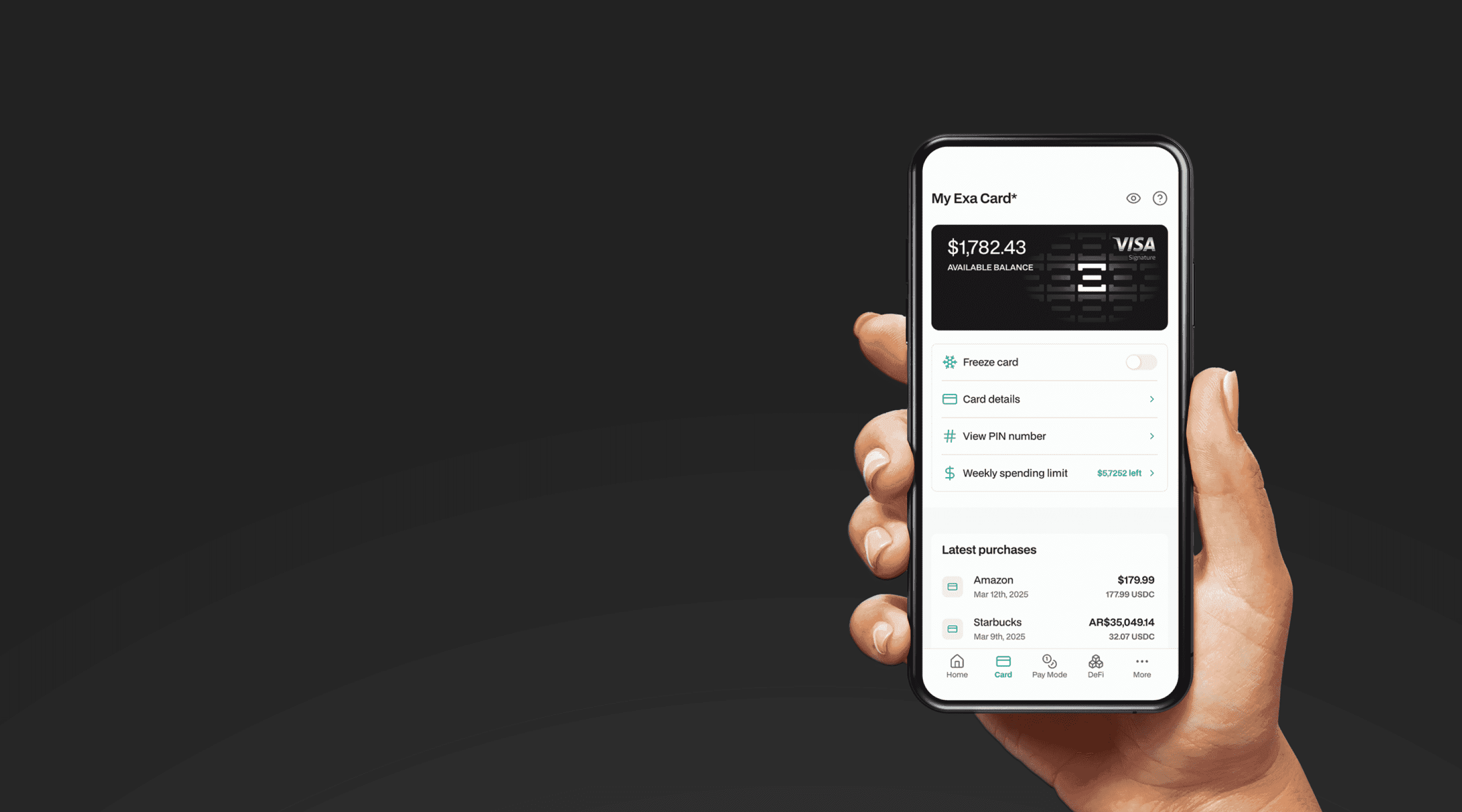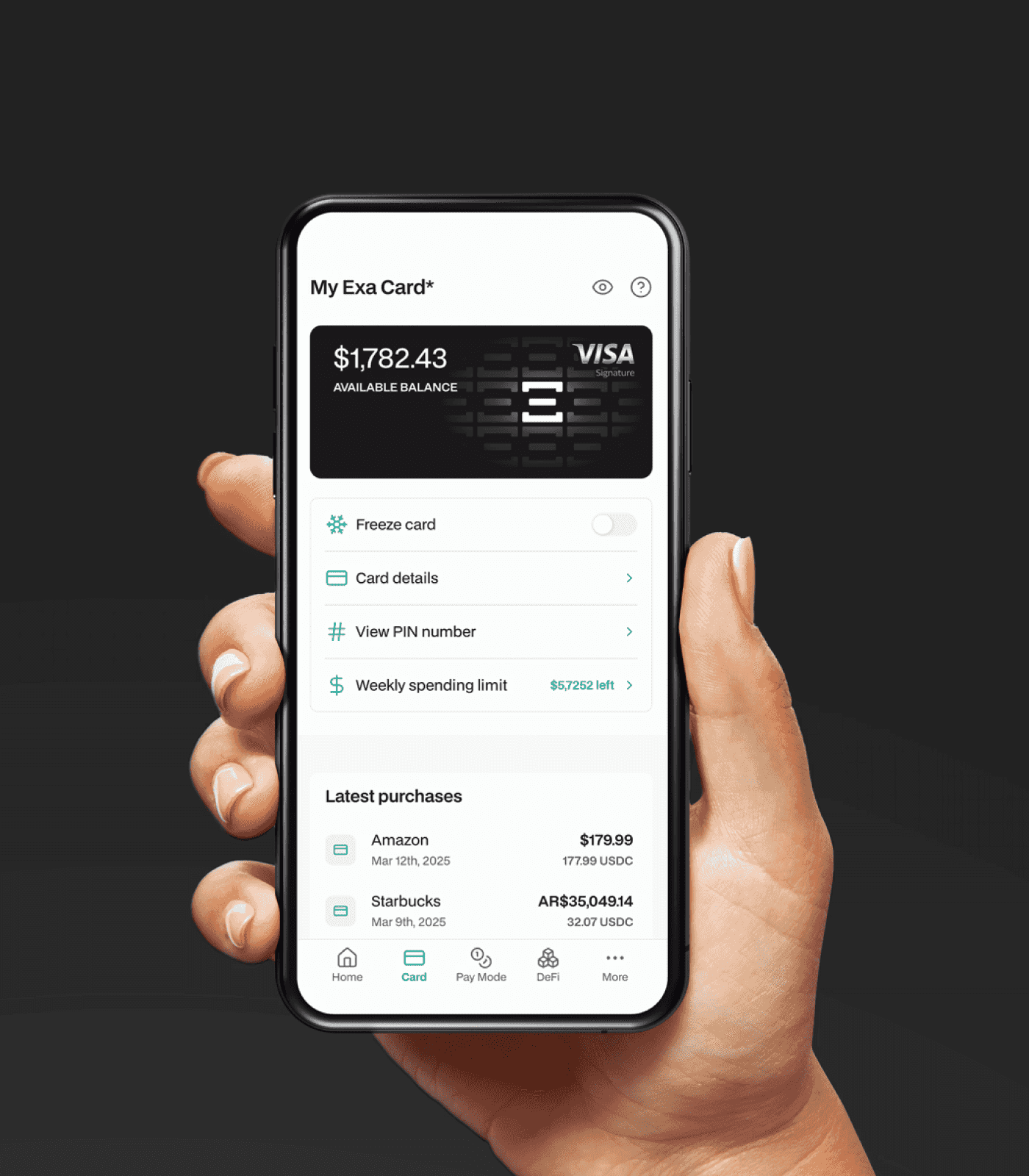 All borrowing and spending features are enabled by non-custodial smart contracts. Terms apply. Cards are issued by licensed third parties; Exa Labs does not issue or manage payment instruments. Yield is variable and not guaranteed. Subject to protocol conditions and smart contract interaction. Access may be restricted in certain jurisdictions.